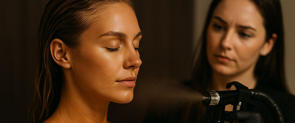 - A fine mist of tanning solution containing Dihydroxyacetone (DHA) is sprayed onto the skin.